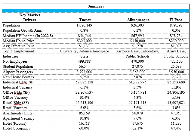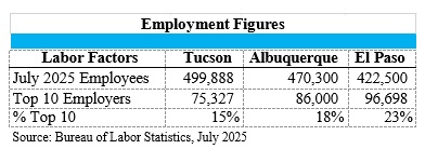 (September 12, 2025) -- The purpose of the Tale of Three Cities is to highlight the strengths and weaknesses of Tucson, Arizona, compared to its sister cities—Albuquerque, New Mexico, and El Paso, Texas. This trio is a sisterhood, as they have many commonalities, including climate and population size. They also all share the distinction of a military base and a university. The statistics and data shown herein illustrate the big picture and may not reflect exact figures. Since our last publication in June of 2024, there have been some changes. There is currently less emphasis on renewable energy and more emphasis on AI and technology. The three cities are also experiencing significant market shifts, similar to the rest of the nation, due to tariffs, immigration policies, and major changes in federal priorities.