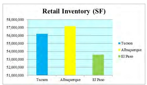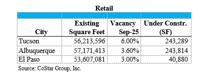 The retail market represents expenditure income, tourism, as well as the contributions related to the retirement and student populations. Notably, that there is a large influx of shoppers from Mexico seeking higher end products and a ‘shopping experience’ in all three cities, but primarily in El Paso and Tucson. All three cities have a similar sized retail market. All three cities have a slightly smaller retail market than in 2025. El Paso’s retail market shrank by about 609K, 495K in Albuquerque, and 326K in Tucson. This means that retail space has been razed or redeveloped into another type of use. The vacancy rate in all three cities did not fluctuate much, with Tucson’s rate increasing from 5.70% in 2024 to 6.00% in 2025, Albuquerque’s rate is the same at 3.60%, and El Paso’s rate increased from 2.50% in 2024 to 3.00% in 2025.