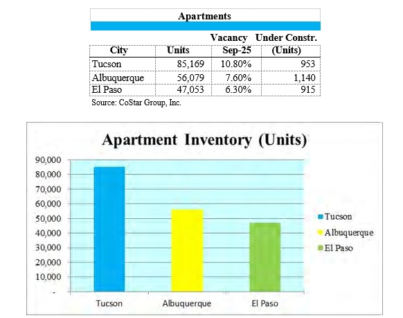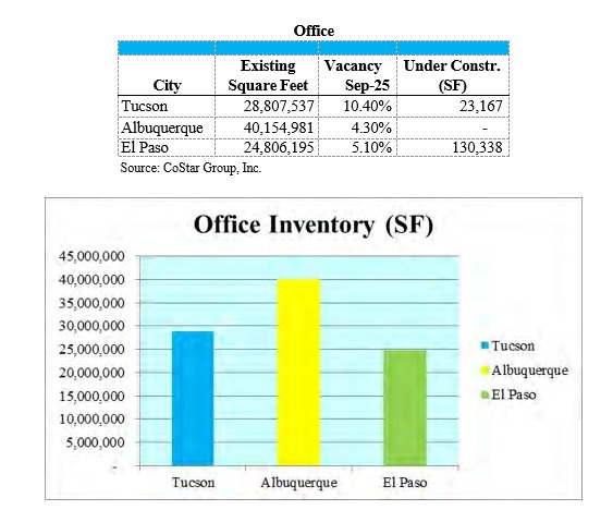 The office market represents the corporate and small business market, financial strength, medical space, and production of a city. In 2025, employees have mostly returned to an office or a hybrid schedule. Albuquerque has the largest office market of the three cities. Once again, this is due to Albuquerque serving as a hub for New Mexico. Tucson has a smaller office market and this is due to Phoenix serving the large corporations in the region. Tucson and El Paso both had a decrease in office inventory from 2024 to 2025, about 156K in Tucson, and 776K in El Paso, which means buildings were either razed or redeveloped into another type of use. The Albuquerque office inventory grew by about 683K from 2024 to 2025. The vacancy rate for all three cities varied during this time period, with Albuquerque showing a slight decline from 4.80% in 2024, and is now at 4.30%. The vacancy rate in Tucson for 2025 is 10.4%, a decrease from 10.8% in 2024, while El Paso’s rate decreased from 5.50% to 5.10%. Tucson and El Paso have a small amount of office space currently under construction.