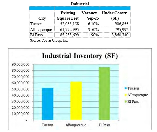 The industrial market is a good indication of manufacturing, production, distribution, and supply in a particular market. As shown in the table and graph below, El Paso has the largest industrial market. This is primarily due to the city’s location along the US-Mexico border. El Paso has become a logistics hub, but vacancy has shot up with exposure to tariffs and increased US-Mexico border restrictions. Albuquerque has the second-largest industrial market. The reason for this is that Albuquerque is distant from surrounding cities and therefore a more desirable geographic location for the distribution hubs and supply centers in between larger cities in the western United States, such as Los Angeles, Denver, Phoenix, and Oklahoma City. Tucson has the smallest industrial market which is primarily due to Phoenix being 100 miles to the north with a larger population, airport, and vicinity to surrounding cities. All three of the cities industrial inventory has grown from 1.9% - 10.6% from 2024 to 2025. El Paso added over 8.16 million square feet and Albuquerque added 1.31 million square feet of new space during this time period. Tucson also added about 950K square feet of new industrial space. The vacancy rate in two of the three cities has increased, especially in El Paso which was 7.10% in 2024 and now is 11.90%. The vacancy in Albuquerque increased from 2.70% in 2024 to 3.50% in 2025, while Tucson’s rate decreased from 6.40% to 6.10%. There are new facilities under construction in all three markets, showing continued demand for industrial space in all three markets.