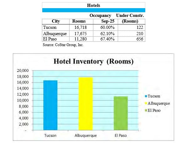 The hotel sector has been generally stable across the three sister cities. In addition, new rental options such as Airbnb, VRBO, and other online options have become significant competitors to the conventional hotel market. The hotel room statistics in Tucson and Albuquerque are generally similar in terms of room count and occupancy. The El Paso market has the fewest rooms, but also has the highest occupancy and rooms under construction. All three cities are adding new rooms, which suggests continued demand for conventional hotels in the three markets.
