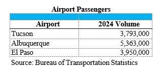 The three airports vary greatly in arrival/departure statistics. The main reason Albuquerque’s traffic volume is much higher than Tucson and El Paso is that the city is distant from surrounding metropolitan areas. Albuquerque also receives a greater amount of volume from tourists traveling to nearby cities in the northern part of state, including Santa Fe and Taos. Tucson posts smaller figures since it is close to Phoenix’s airport, which has more travel options and often offers lower prices. The airport traffic statistics are shown in the following table.