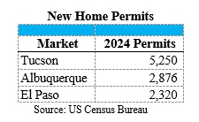 The number of new home permits includes single family and multi-family residences. Tucson shows much higher new home permits for 2024. On the other hand, Albuquerque and El Paso show generally similar new home permit figures.