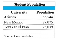 All three cities have a State University with a significant impact on the local economy. The University of Arizona (UA) is the largest of the three and has the largest impact on the local economy and politics. The University of New Mexico (UNM) and Texas at El Paso (UTEP) also have a significant positive impact on their respective communities. From the previous 2023-2024 academic year, the UA has grown by 6%, UTEP had growth of 3%, and UNM had the greatest growth at nearly 7%. The table below shows the enrollment of the three universities, for the 2024- 2025 academic year. As of September of 2025, the Fall 2025 enrollment figures were not released for all three universities.