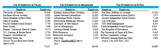 The top 10 employers in Tucson account for over 75K jobs in 2020. In Albuquerque, the top 10 employers account for over 86K jobs in 2023, and for El Paso, over 96K jobs. A military base is one of the top 3 employers in each of the sister cities, and governmental entities account for most of the jobs. Of the three cities, Tucson has the most private employers in the Top 10 with Raytheon, Banner, Freeport, and Walmart. Education and healthcare represented most of the top 10 in El Paso.