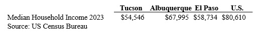 The U.S. median household income was $80,610 in 2022. All three cities have a lower median household income than the national median. Fortunately, all three cities have posted an increase in median household income from 2022. The lower wages are attributed to the proximity to the border and inexpensive living costs. Albuquerque stands above the other two cities, while Tucson and El Paso have a similar 2023 median household income. Unfortunately, there are concerns with high rates of poverty in all three cities.