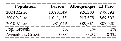 The populations of all three cities have grown by a small amount from 2020 to 2024, and at a generally similar pace of 0.8%, 0.2%, and 0.3%. Tucson is the only city that is currently growing at a faster rate than it was from 2010 to 2020. From 2010 to 2020, Tucson grew at 0.6%, Albuquerque at 0.3%, and El Paso at 0.8% annually.