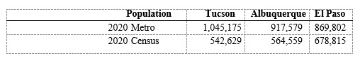 The populations of the three metropolitan areas are similar. However, the 2020 census numbers are much lower. This is simply the result of city limits. Tucson is 241 square miles, Albuquerque is 187 square miles, and El Paso is 259 square miles. All three cities are spread out, accounting for the significant difference in metropolitan population versus census figures. The population of each city is shown in the following table.