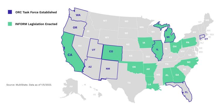 Thirteen states – Arkansas, Alabama, California, Colorado, Georgia, Illinois, Iowa, Louisiana, Michigan, North Carolina, Ohio, Oklahoma and Pennsylvania – have enacted similar versions of the federal “INFORM Consumers Act” over the last two years. And while INFORM proves to be an effective tool for preventing stolen products from being fenced online, much attention will now be paid to how policies dealing with ORC will be enforced in the new year.