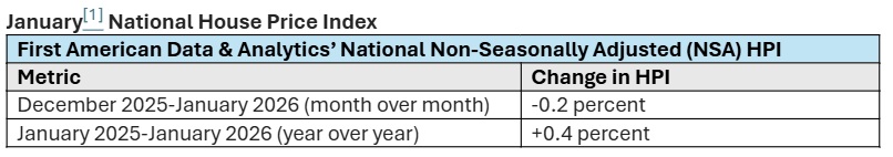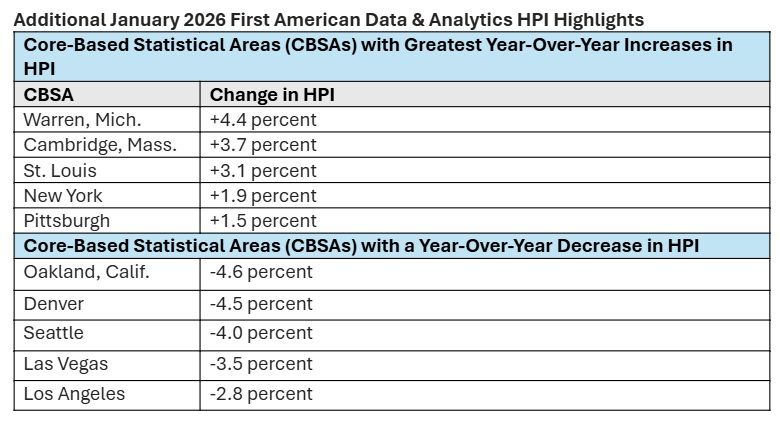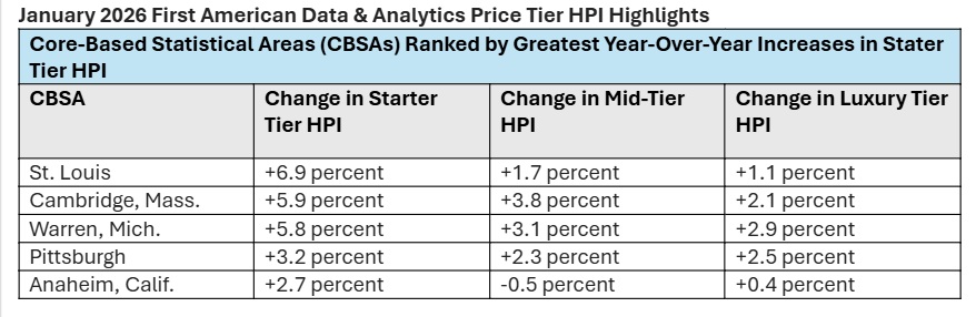 PHOENIX (Feb. 26, 2026) – First American Data & Analytics, a leading national provider of property-centric information, risk management and valuation solutions and a division of First American Financial Corporation (NYSE: FAF), today released its January 2026 Home Price Index (HPI) report. The report tracks home price changes less than four weeks behind real time at the national, state, and metropolitan (Core-Based Statistical Area) levels and includes metropolitan price tiers that segment sale transactions into starter, mid, and luxury tiers. The full report can be found here.