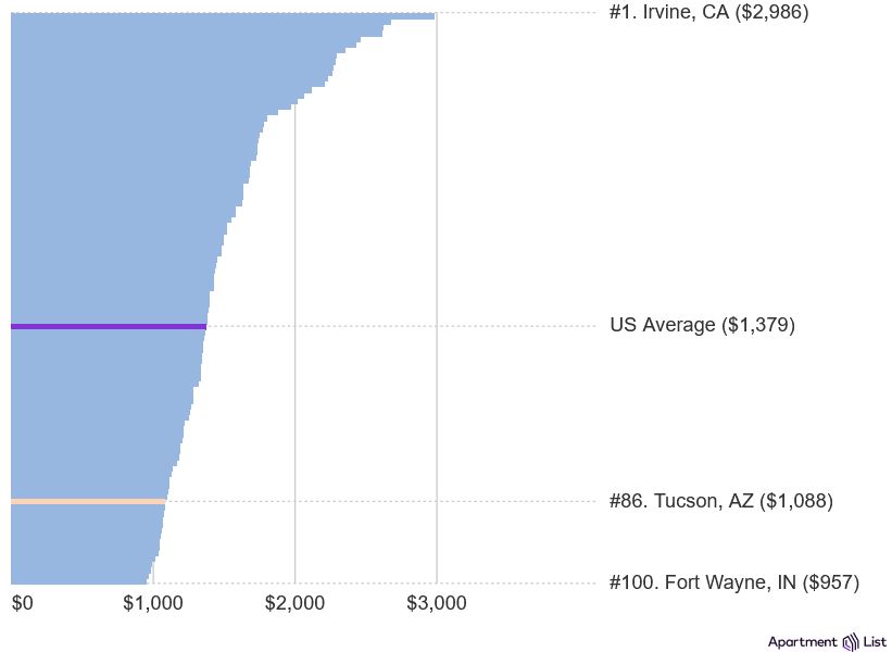 Tucson is the #86 most expensive large city in the U.S., with a median rent of $1,088