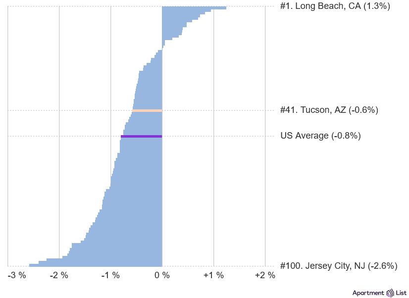Tucson rents went down 0.6% in the past month, compared to the national rate of -0.8%. Among the nation's 100 largest cities, this ranks #41. Similar monthly rent growth took place in Huntsville, AL (-0.6%) and Houston, TX (-0.6%).