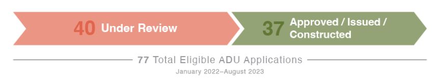 Tucson has permitted ADUs in residential zoning since in January 7, 2022. According to Tucson's Planning and Development, there have been 77 applications for ADUs since then. Of the 77 applications, 37 have been approved/issued/completed. Others are still in review. Additionally, some may have expired or been withdrawn since applying.