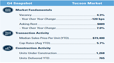 The Tucson multifamily market closed 2020 on an upswing, sustaining the momentum that was achieved during the third quarter. The local vacancy rate dipped to its lowest level in more than two decades, and rents continued to post healthy gains.